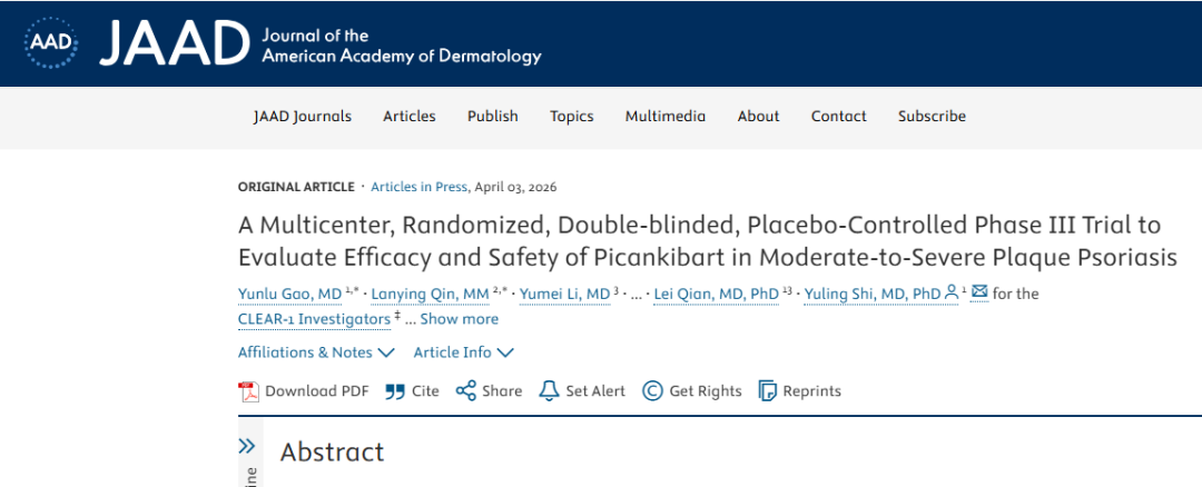 [i] Gao Y, Qin L, Li Y, et al. A Multicenter, Randomized, Double-blinded, Placebo-Controlled Phase III Trial to Evaluate Efficacy and Safety of Picankibart in Moderate-to-Severe Plaque Psoriasis. J Am Acad Dermatol. Published online April 3, 2026. doi:10.1016/j.jaad.2026.04.001