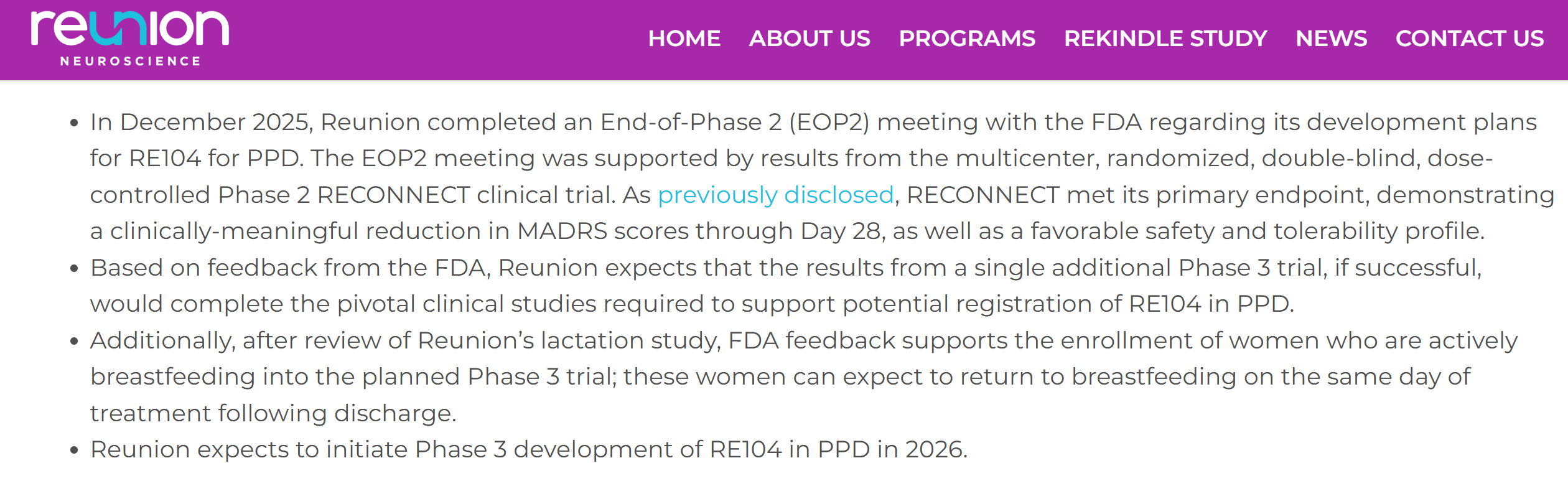 目前已有企业开始着手调整研发策略。Reunion公司在其官网公开表示(见下图),其治疗重度产后抑郁症(PPD)药物RE104在Ⅱ期临床试验中已取得顶线积极结果。该公司已经与FDA沟通并获得反馈,计划于2026年仅开展一项关键III期临床试验;若此项试验获得成功,则可凭借该关键临床数据支持RE104针对PPD适应症的上市申报。