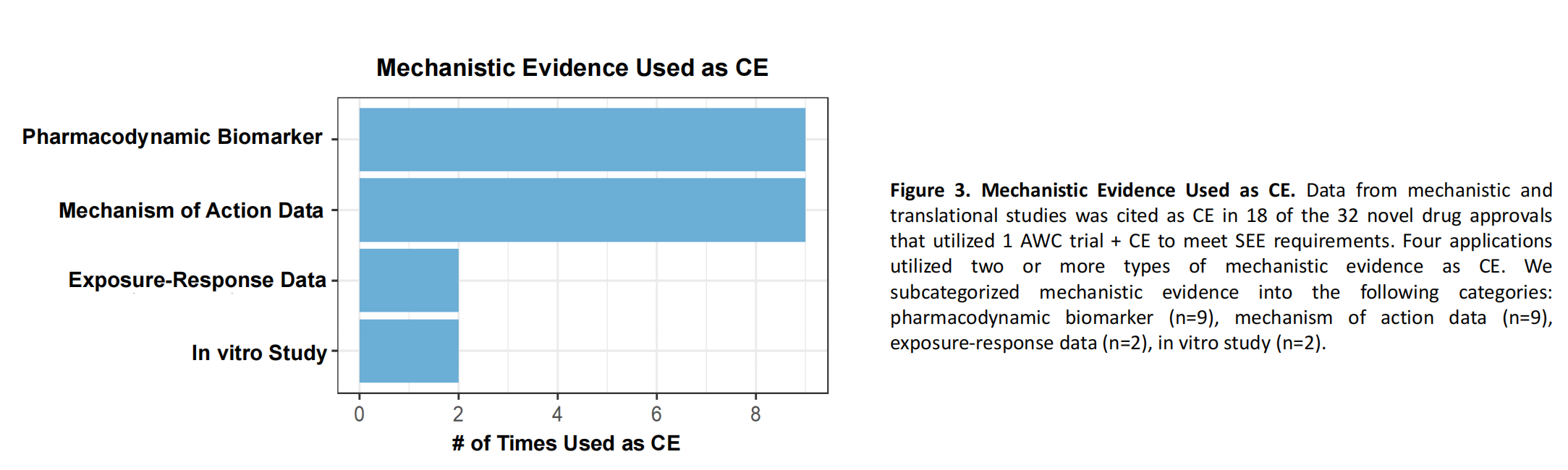 其中,机制或药效学证据是应用最广泛的类型,具体包含PK/PD、生物标志物和药物作用机制数据。