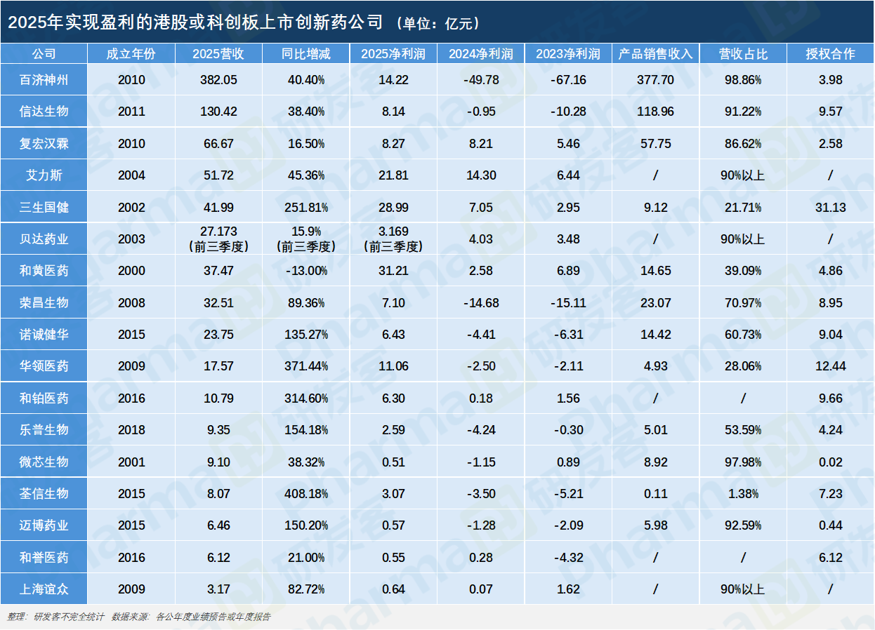 又到了一年一度上交成绩单的时候。不出意外,2025年迈入盈利新阶段的Biotech更多了。据研发客不完全统计,在港交所及科创板上市的创新药企中,2025年实现盈利的至少有17家,相比2024年增加近55%: