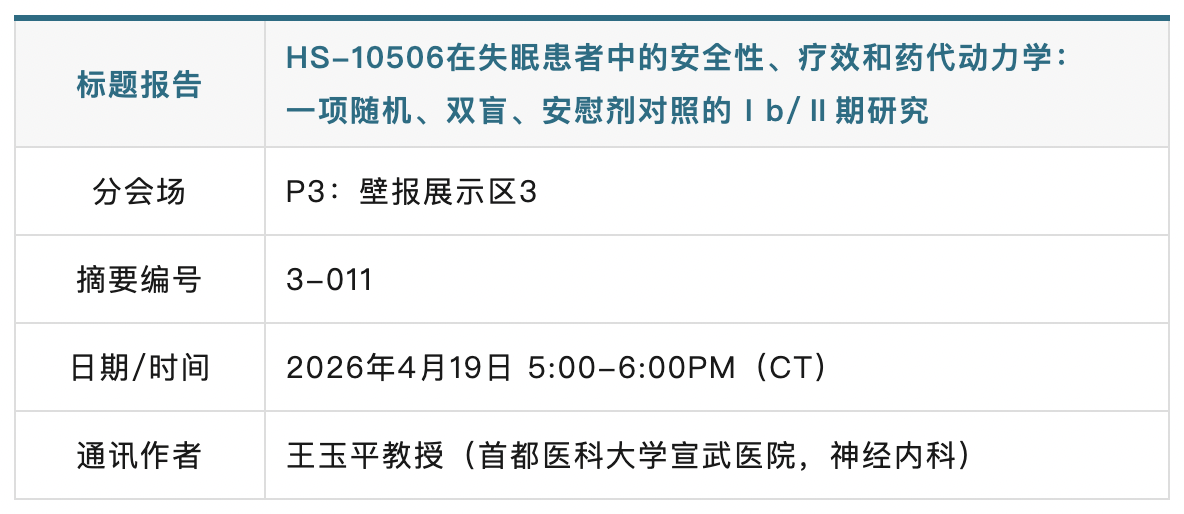 2026年4月21日 , 翰森制药集团有限公司(以下简称“翰森制药”,03692.HK)宣布在2026年美国神经病学学会(AAN)年会上发布了HS-10506研究数据,该会议于4月18-22日在美国芝加哥举行。