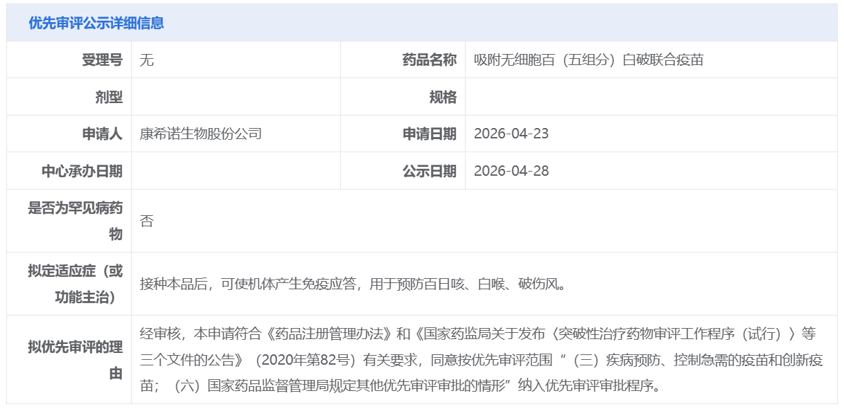 康希诺的吸附无细胞百(五组分)白破联合疫苗获CDE拟纳入优先审评