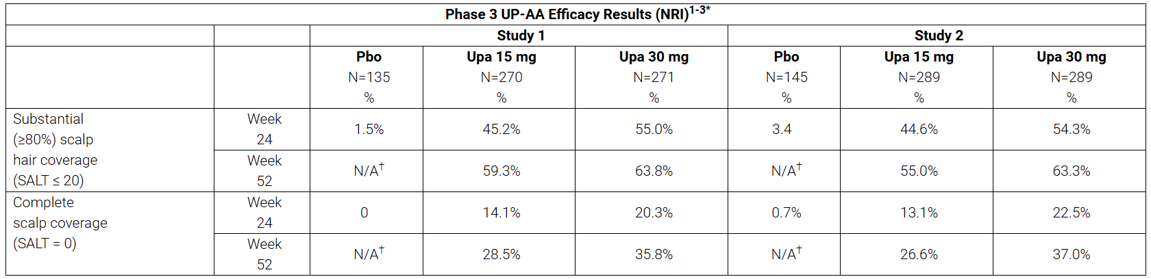 UP-AA includes two replicate studies with Period A as a double-blind, placebo-controlled phase for 24 weeks, followed by Period B, a blinded extension through 52 weeks. Results from Period B are summarized descriptively.