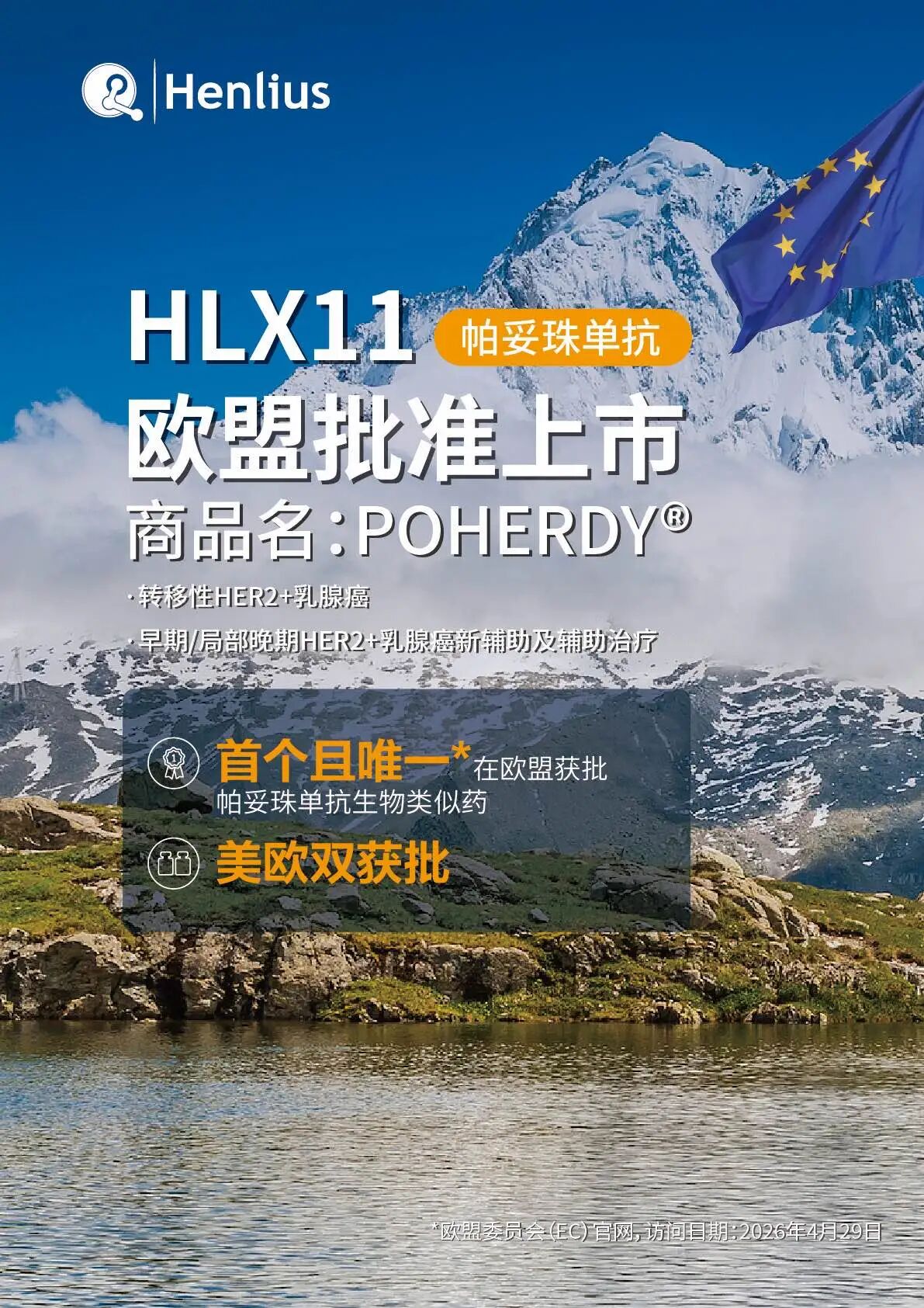 中国上海 & 美国新泽西州泽西市,2026年4月29日 —— 复宏汉霖(2696.HK)与Organon(纽交所代码:OGN)今日联合宣布,欧盟委员会(European Commission, EC)已批准POHERDY®(帕妥珠单抗)420 mg/14 mL静脉注射液的上市许可。该产品是欧洲首个且目前唯一获批的PERJETA(帕妥珠单抗)生物类似药,获批适用于参比制剂的全部适应症1。
